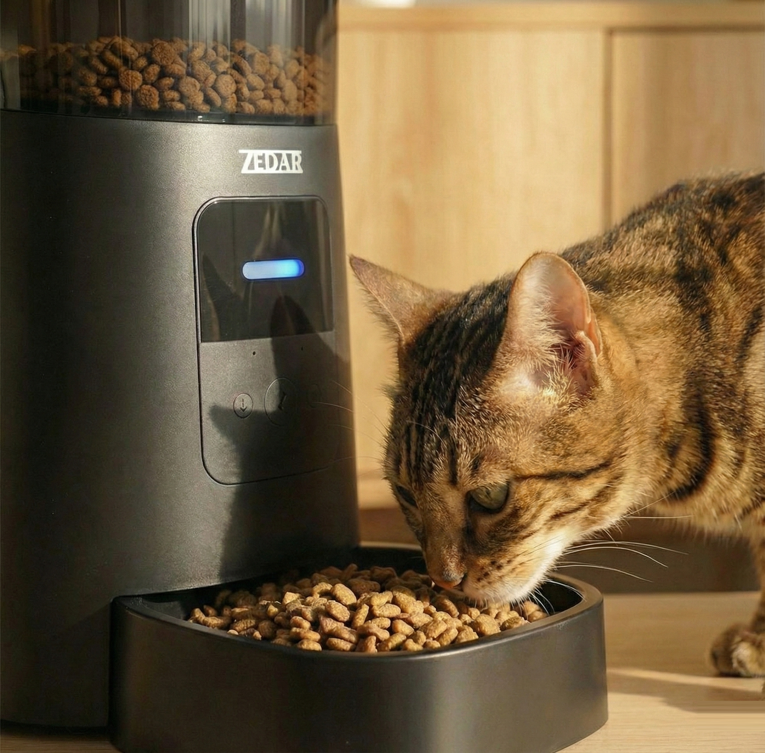 Een voerautomaat voor katten is een automatische voerbak met een ingebouwd reservoir en doseersysteem. Je vult de Zedar A600 of A900 met droogvoer, stelt via de app de voertijden en porties in, en de automaat laat op die momenten automatisch de juiste hoeveelheid brokjes in het bakje vallen.